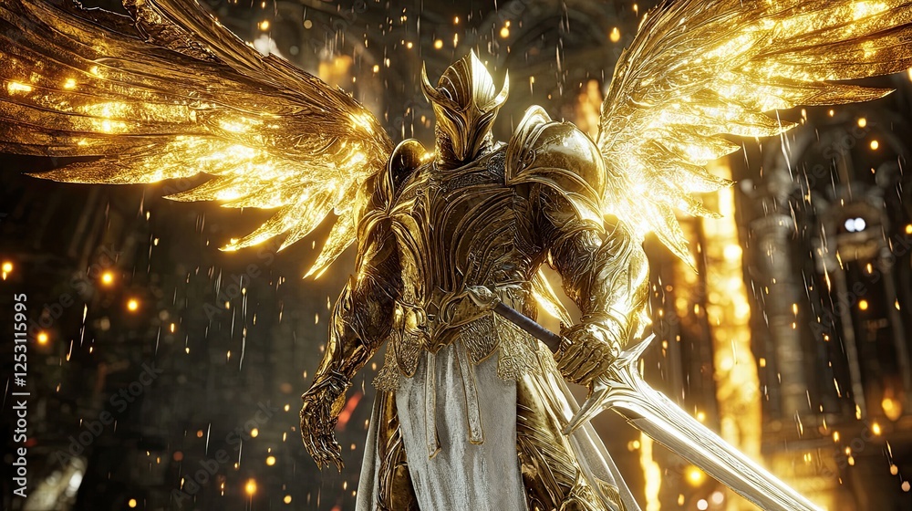 • A divine light shines on the angel knight, armed with a sword and encased in armor, as they hover