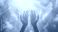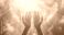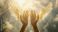 • a pair of open hands reaching towards the viewer, with angel wings spread behind them; ethereal light filtering through white clouds above; soft and warm color palette with highlights on each hand's