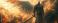 • Powerful angel warrior with glowing wings holding sword in dramatic sky