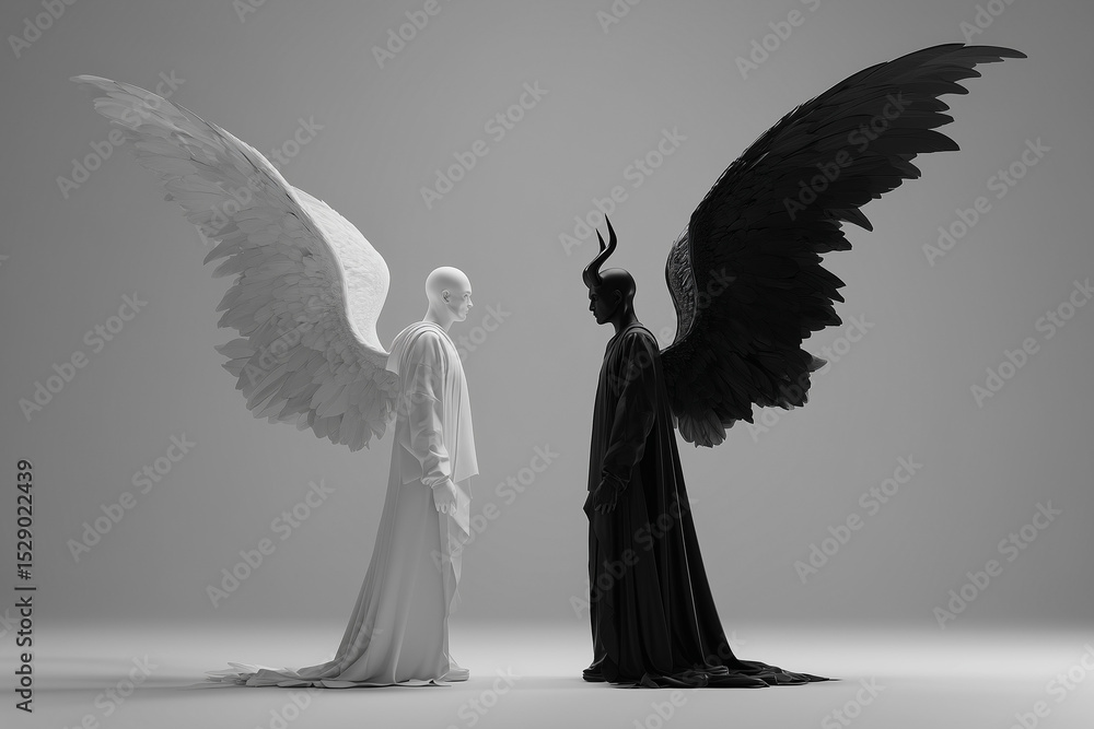 • Two figures of an angel and a demon opposite each other, white and black. The confrontation of good and evil