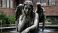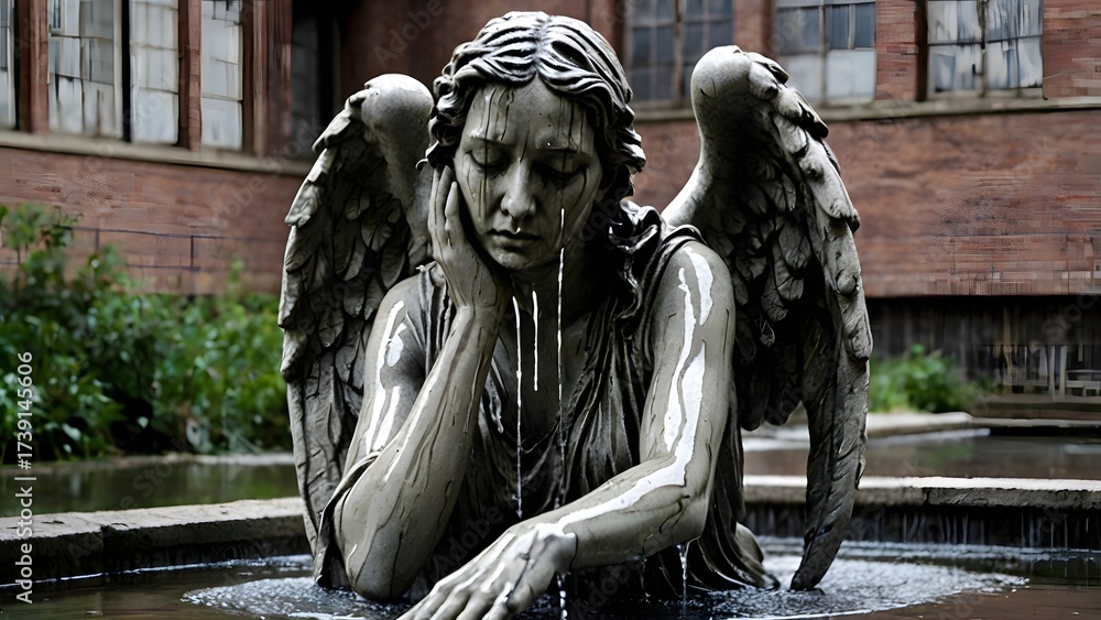 • A weeping angel statue with water streaks resembling tears, set in an abandoned urban courtyard 2