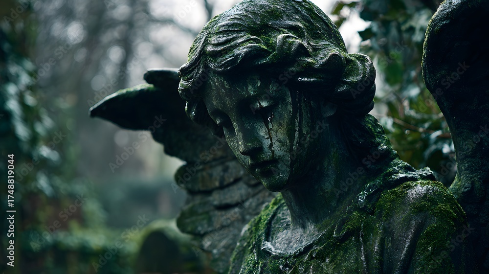 • Angel statue cemetery art: weeping angel sculpture, moss covered gravestone memorial art