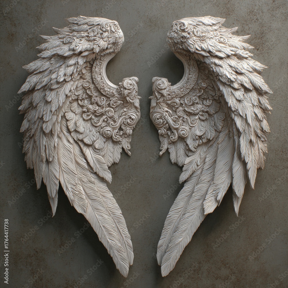 Anioł - Intricate angel wings sculpture displayed on a textured wall in a softly lit room #1764417738