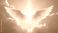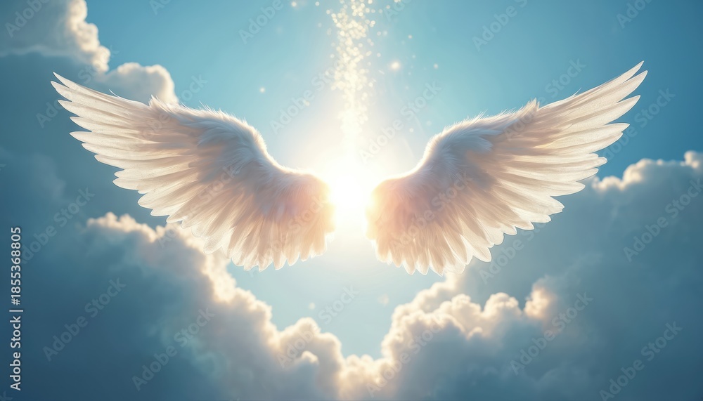 • Pair of ethereal white angel wings spread open against a bright sunlit sky with clouds. Light flares and sparkles descend from above, creating a heavenly scene.