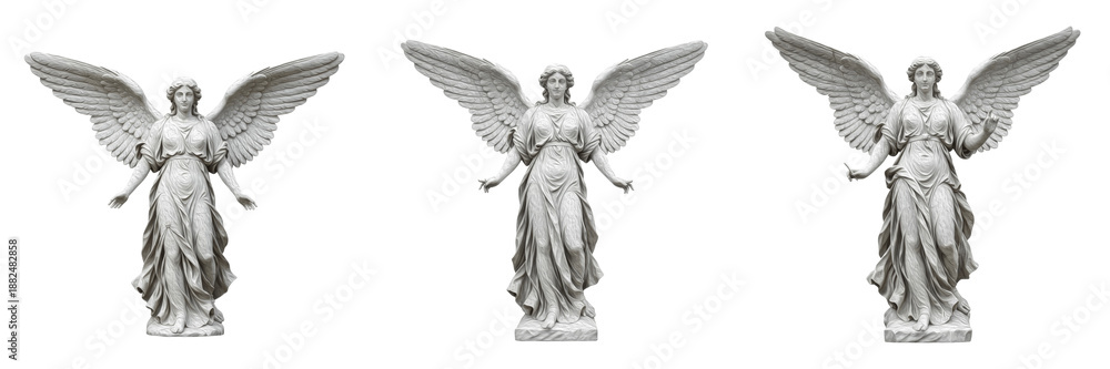 • Set of three winged angel statues in different poses isolated on white background, stone sculpture of female celestial figure