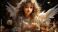 A woman angel is standing in the sky with her wings spread out