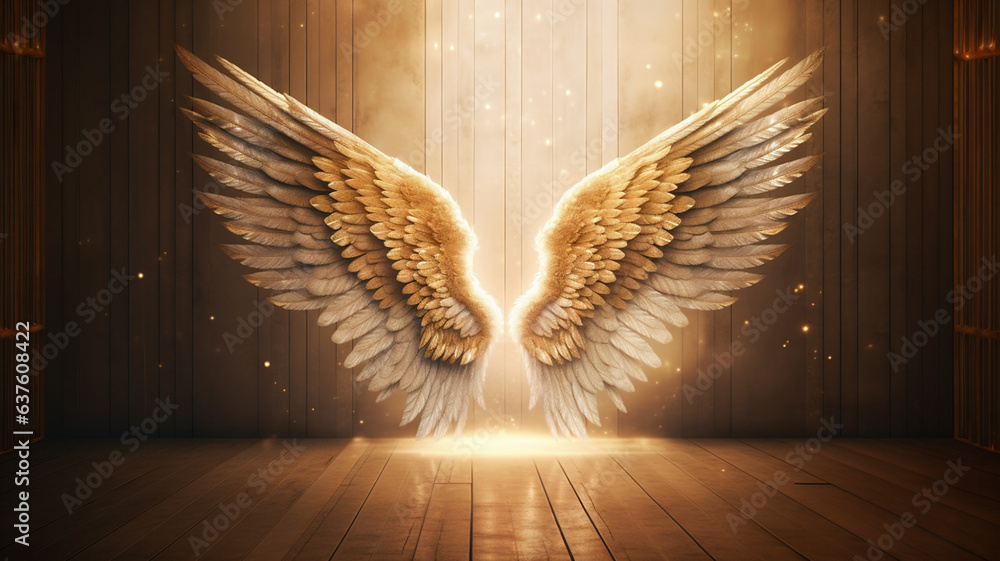 Anioł - A pair of gold angel wings in a photography studio backdrop. Potential graphic resource for use... #637608422
