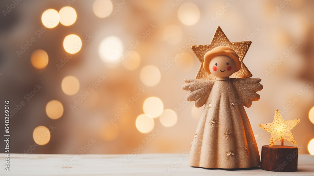 Anioł - wood figurine of an christmas angel in front of an bokeh background #648269016