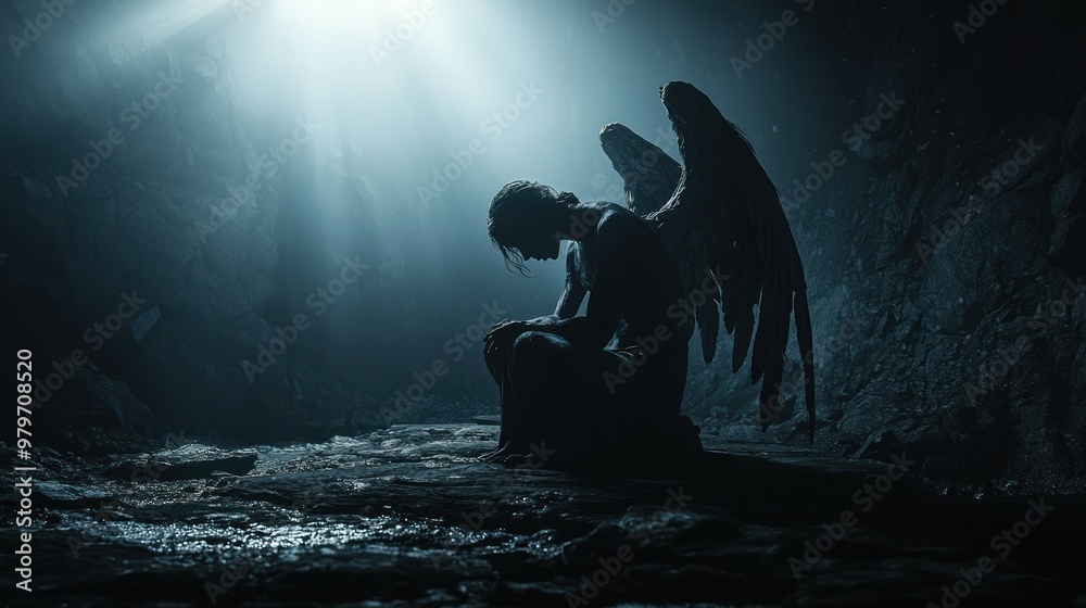 • A dark, dramatic depiction of a fallen angel with torn wings, kneeling on a rocky surface, illuminated by a faint light from above.