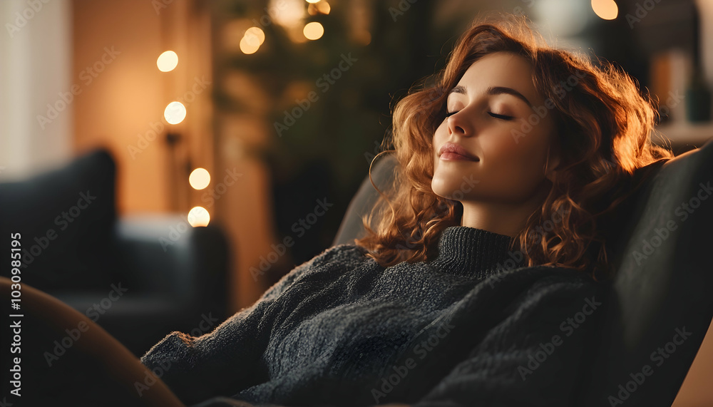 Relaks - A woman peacefully sitting and relaxing in a cozy armchair #1030985195