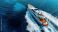 • An elegant yacht smoothly navigates the expansive open sea with grace. The deep blue water contrasts with white trails, symbolizing luxury and peaceful seafaring.
