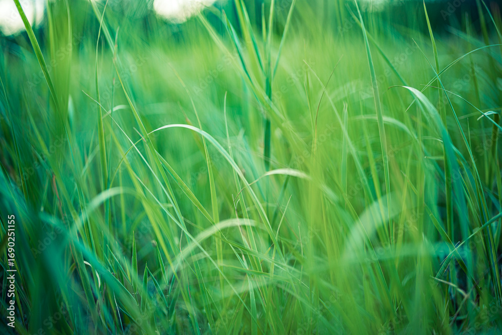 Relaks - Abstract closeup of green grass in meadow with soft sunlight, peaceful natural background showing... #1690251155