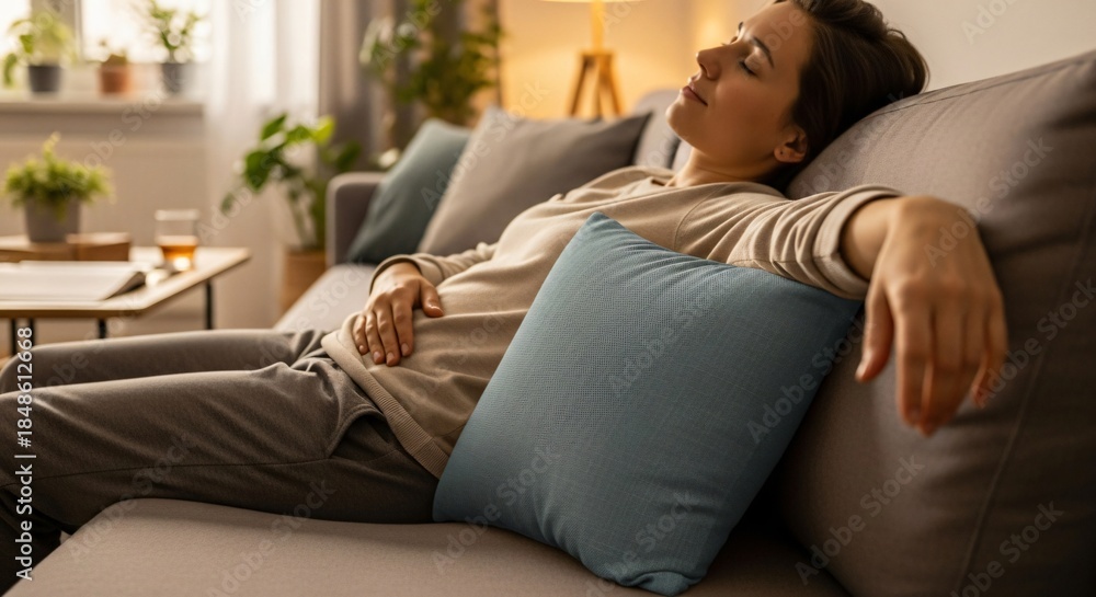 Relaks - A young woman peacefully napping on a comfortable sofa in her cozy living room, enjoying a moment... #1848612668