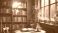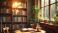 • Cozy library corner with open book, cup of coffee, steam. Bookshelf filled books. Study room is illuminated sun, plants. Knowledge and relaxation for readers at home.