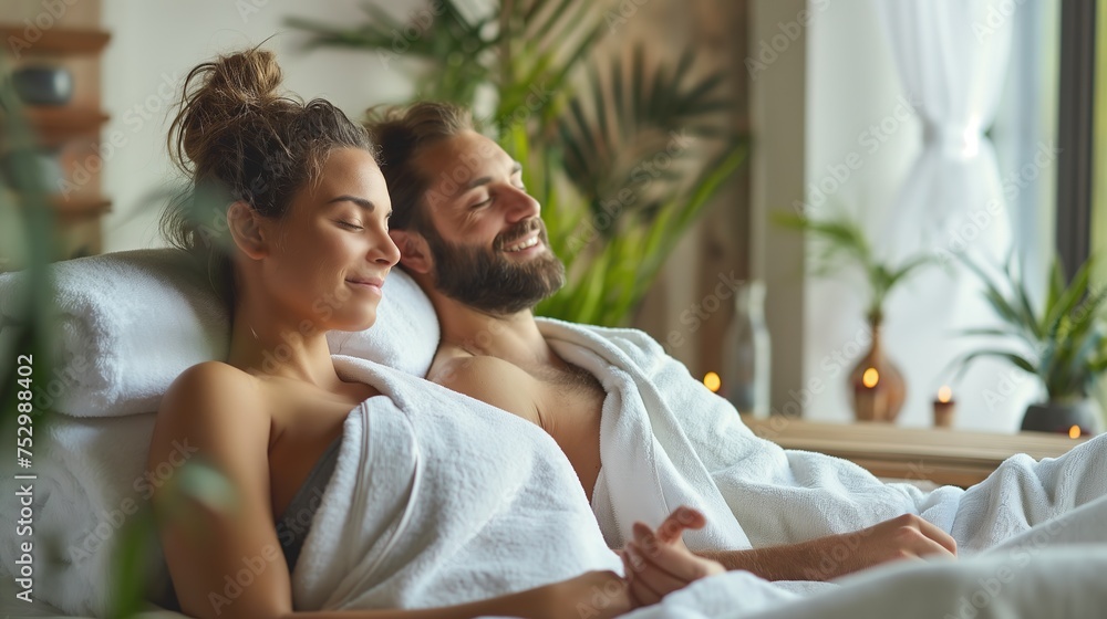 Relaks - couple enjoying spa relax in hotel facility, smiling couple wearing towel, Generative Ai #752988402