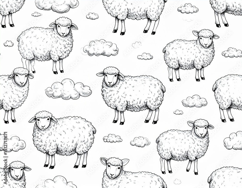 Trendy - Czarno-biały wzór z owcami i chmurami, szkic, rysunek, tapeta #1512713671