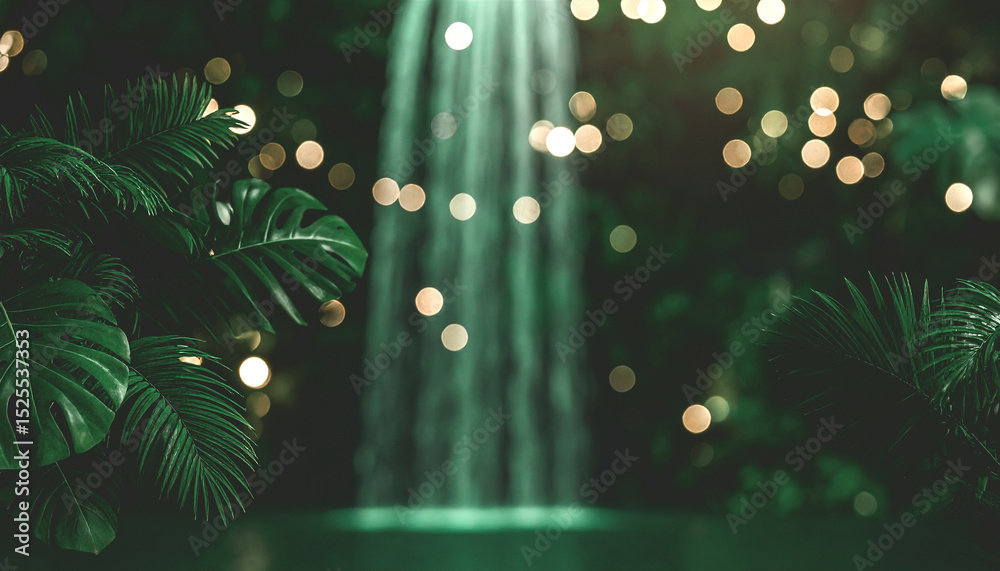 • Tapeta do łazienki, liście, dżungla, wodospad i zielone egzotyczne rośliny, tło do projektu, efekt bokeh