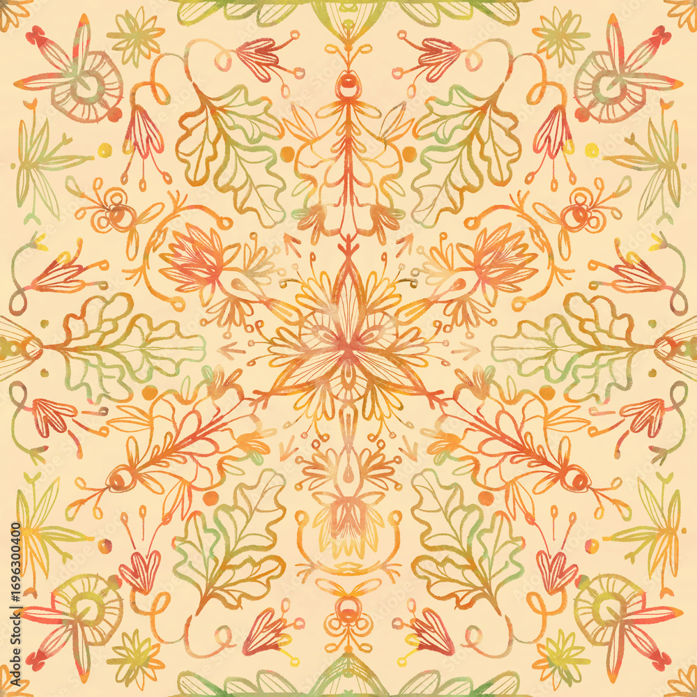 • Jesienny wzór liście, kwiaty, symetria na jasnym żółtym tle
