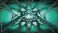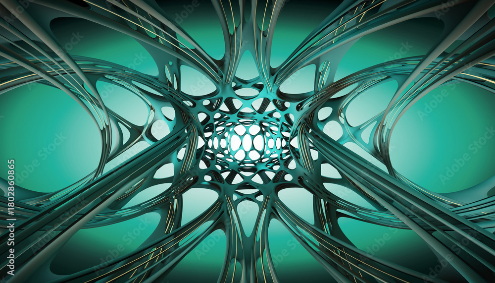 • Futurystyczna tapeta z liniami zbiegającymi się na środku ilustracji. Ilustracja w kolorach zieleni.