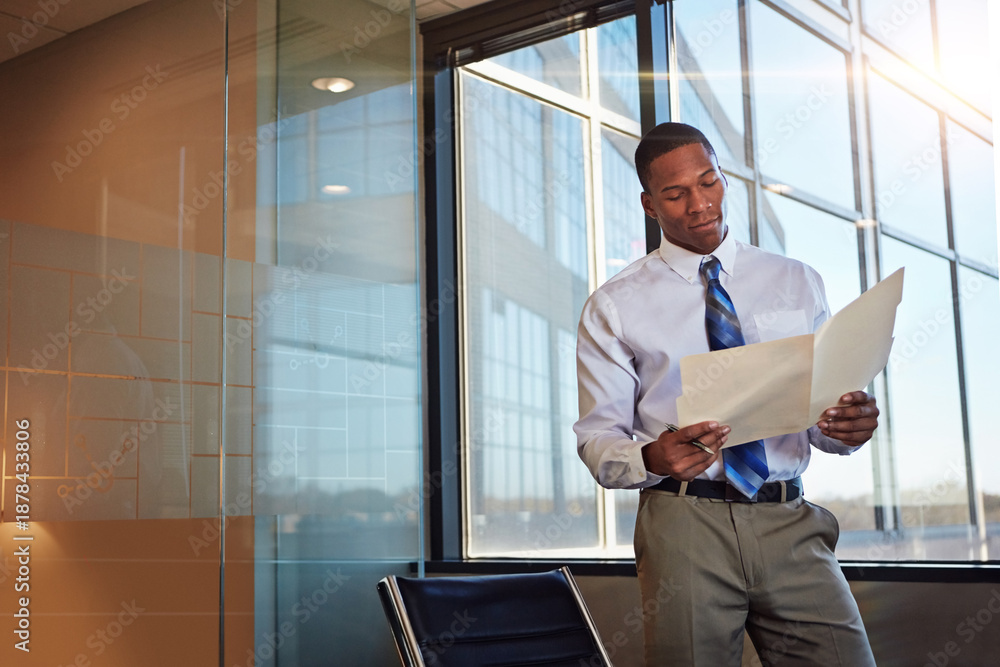 Instrumenty muzyczne - Black man, lawyer and reading folder in office for case file, witness statement and legal... #1878433806