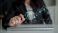 • A business professional examines financial data using a magnifying glass over a keyboard, emphasizing accuracy and insight in a modern office environment. Scalp