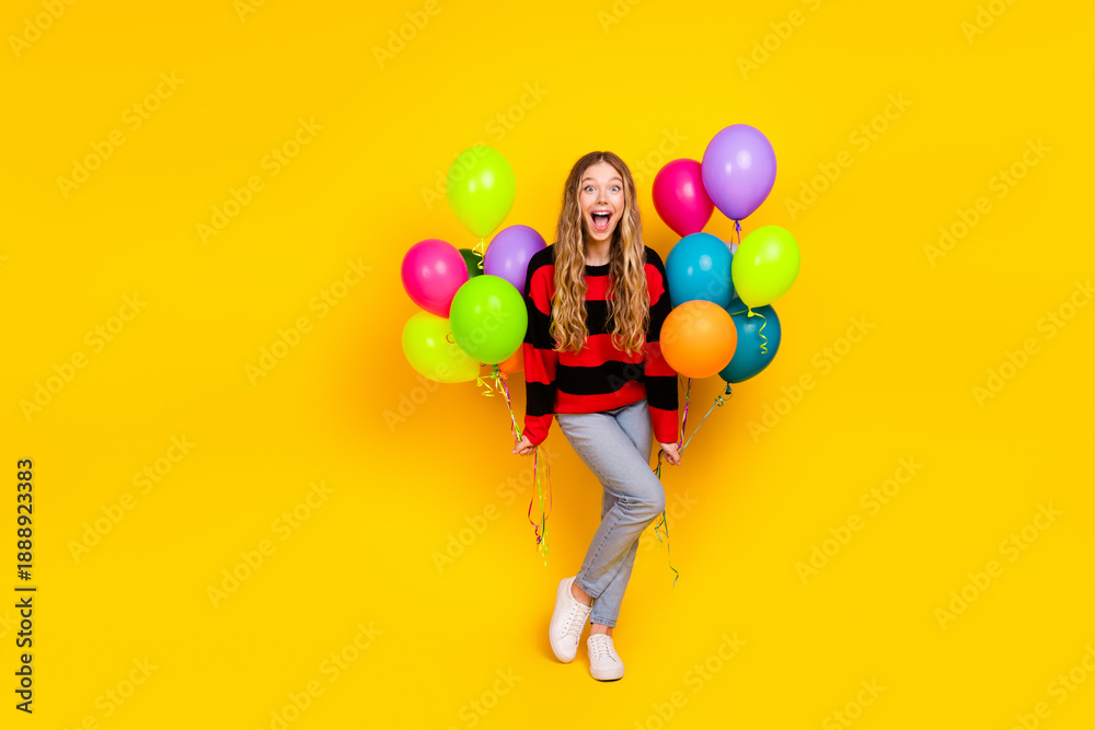 • Lovely young girl holding colorful balloons on a cheerful yellow background, dressed in a stylish casual sweater