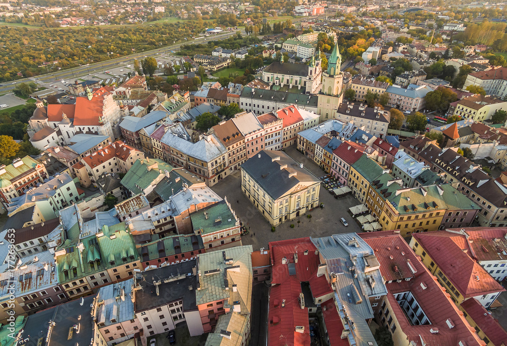Fototapety Miasta - Lublin - stare miasto z Trybunałem Koronnym i wieżą Trynitarską widziane z powietrza. Widok z... #177263653