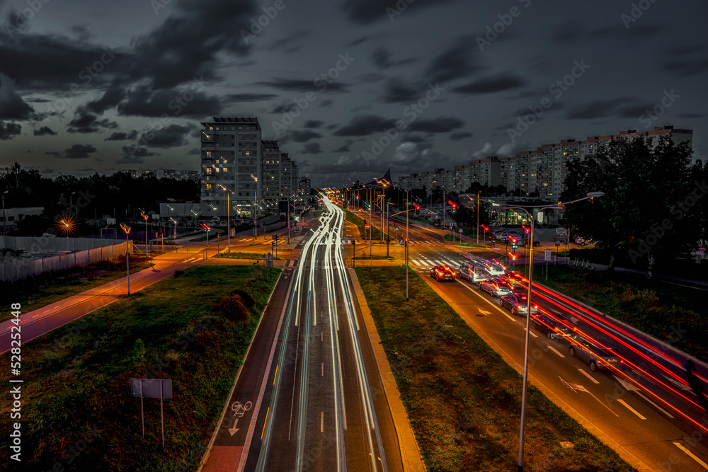 Fototapety Miasta - Długa ekspozycja, ruch uliczny nocą, miasto nocą. #528252448