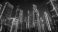 • W nocnym krajobrazie mega miasta wyróżniają się potężne wieżowce z neonowymi iluminacjami, które odbijają się w szklanych fasadach budynków.