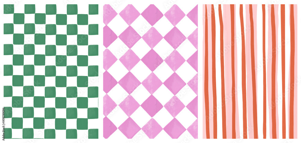 • Hand-painted background Set of gingham, stripe and checkered pattern. Backdrop for wedding invite, poster, social media, banner templates .