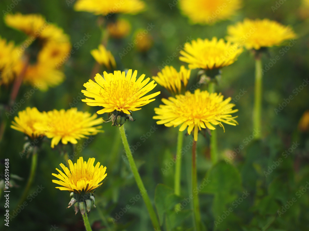 Fototapety Dmuchawiec - Dandelion (Taraxacum officinale) flowering in a field. #106519688