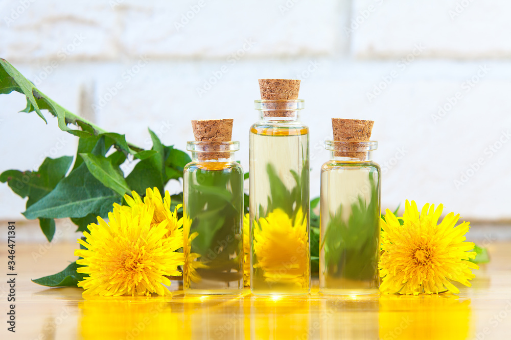 • dandelion essential oil in beautiful bottle on table