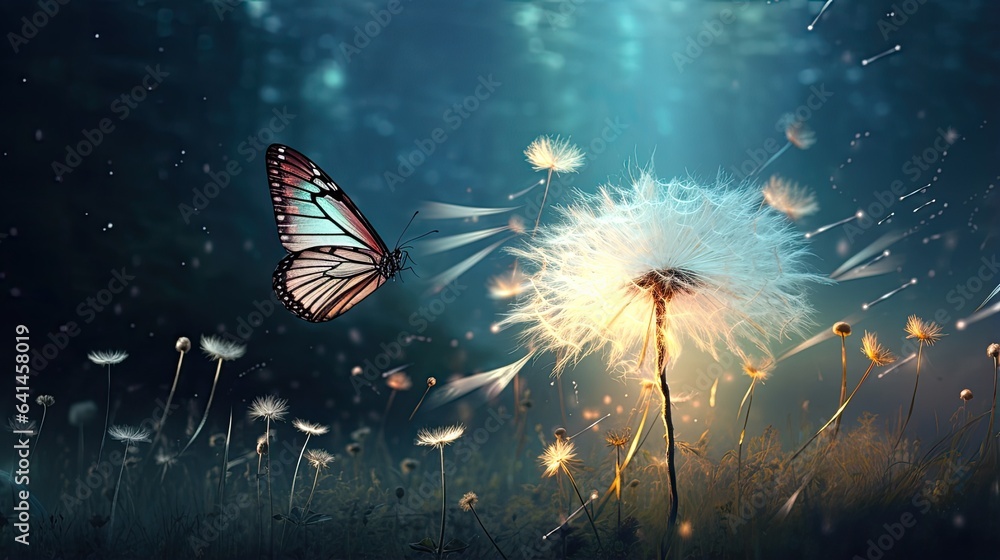 Fototapety Dmuchawiec - a dandelion with its seeds dispersing in the wind, while a butterfly adds a sense of dynamism to... #641458019