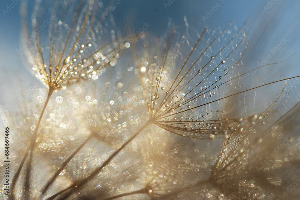Fototapety Dmuchawiec - Dmuchawiec w kroplach wody w ciepłych odcieniach #684669465
