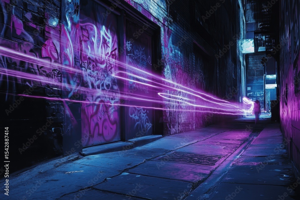 • Glowing neon lights illuminate dark city streets with vibrant graffiti art at night, Dark city streets graffiti doors, glowing neon abstract light trails animated background