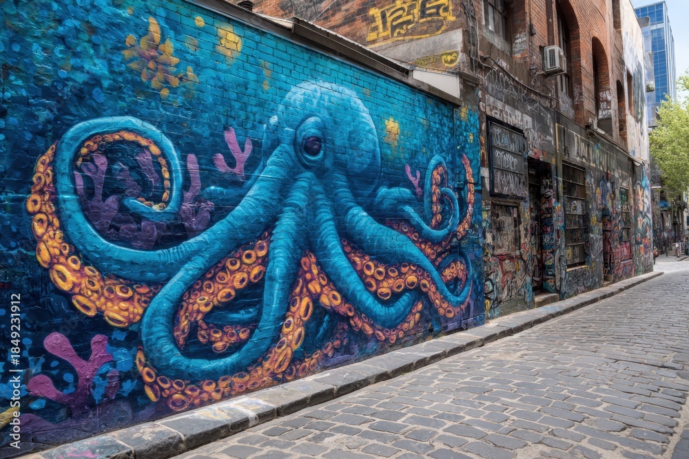 Fototapety Street Art - Colorful octopus street art captures attention in Melbourne's June #1849231912