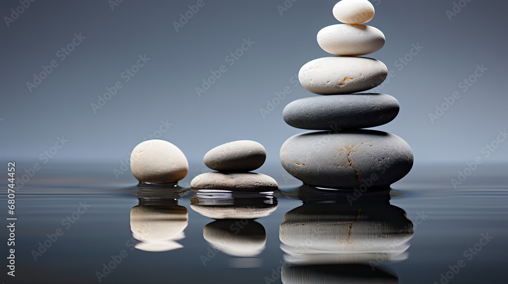 • Kamienie zen ułożone na sobie na tafli spokojnej wody.