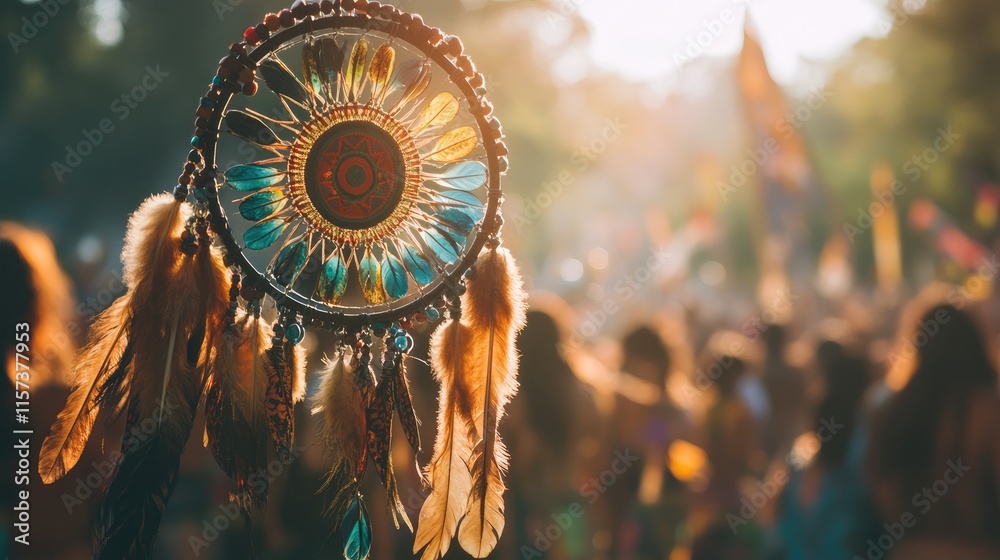 • Dreamcatcher at Music Festival with Vibrant Beads and Feathers Capturing the Spirit of Art and Rhythm in a Lively Outdoor Setting