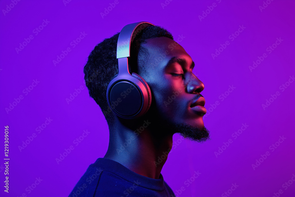 • Man enjoys music with headphones. Young man with headphones listens to upbeat music. Profile portrait, vibrant colors, stylish. Studio shot. Stylish modern lifestyle. Trendy fashion accessory. Man