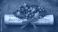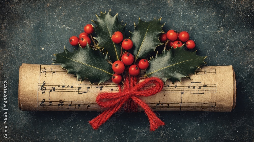• A rolled sheet of vintage music tied with red string, decorated with holly leaves and berries, on a dark textured background.