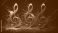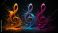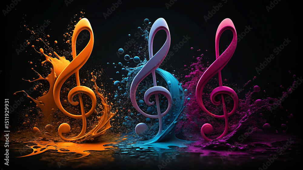 • Three vibrant treble clef symbols in colorful paint splashes abstract music background