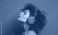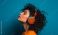 • A young woman with curly hair is immersed in music while wearing bright orange headphones against a blue background