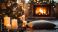 • Fireplace scene with meditation cushion, holiday decorations, twinkling lights, and Christmas music ambiance, cozy festive interior, peaceful winter atmosphere, copy space