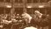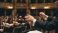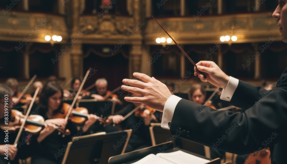 • A conductor leading an orchestra in a grand concert hall during a classical music performance