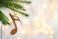 • Fir tree branch with wooden note against blurred lights, space for text. Christmas music