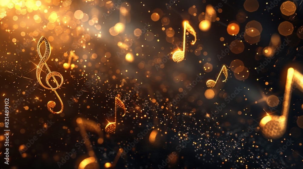 Fototapety Muzyka - Gold music notes on dark background with bokeh lights. #821489102