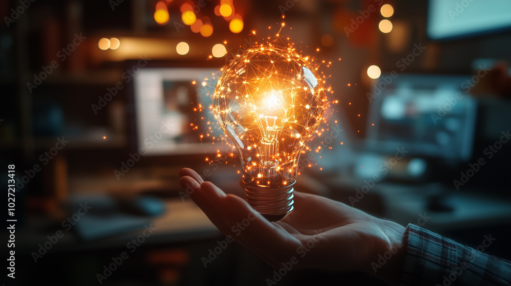Fototapeta do Biura - W skupieniu nad swoją pracą, biznesmen trzyma w dłoni mały, lśniącą żarówkę, symbolizujący nową,... #1027213418