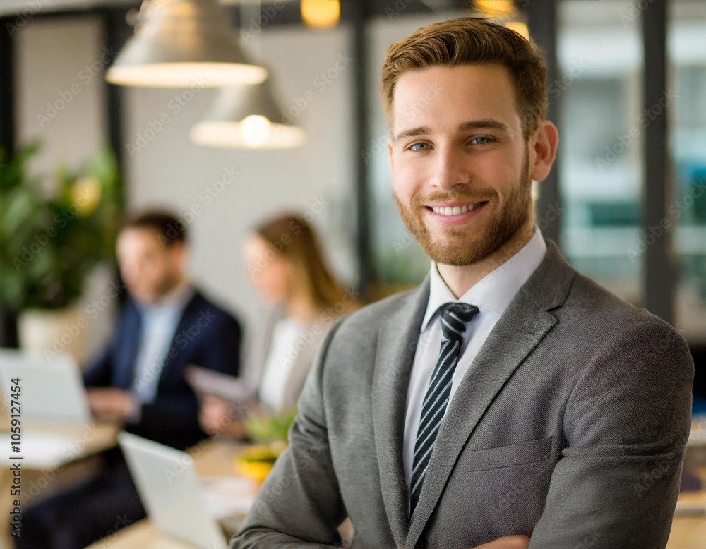 Fototapeta do Biura - Biznesmen uśmiechnięty pracownik biurowy w garniturze na spotkaniu w biurze #1059127454