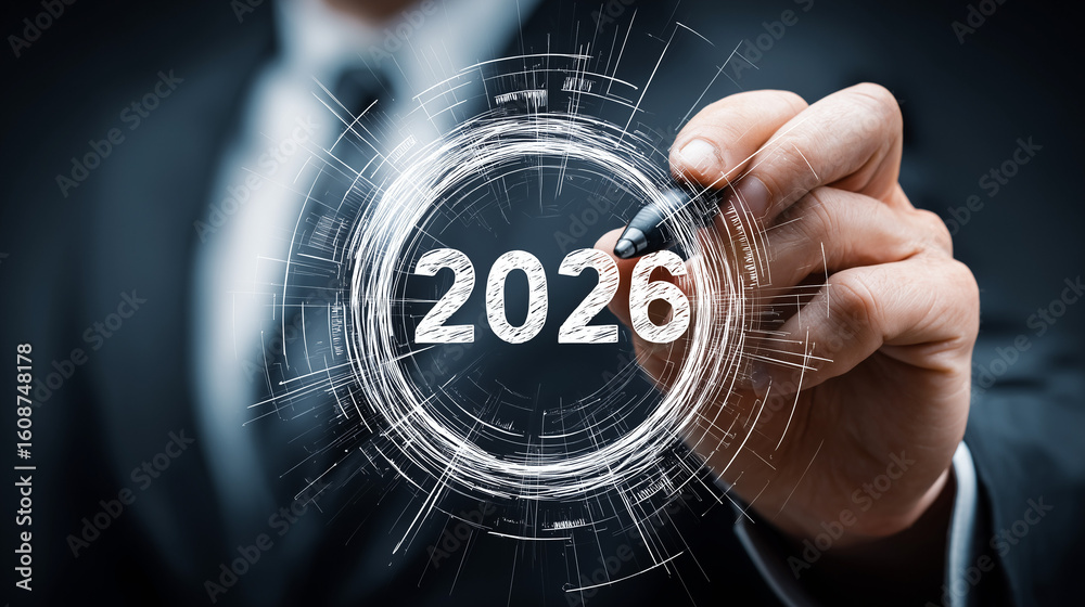 Fototapeta do Biura - Biznesmen rysujący miernik postępu z datą 2026 - symbol rozwoju, efektywności i strategii na nowy... #1608748178