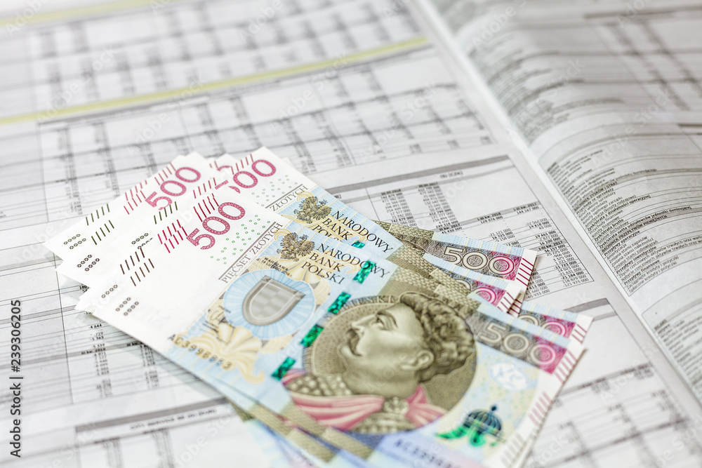 Fototapeta do Biura - Plik banknotów 500 PLN na tle wyników finansowych spółek #239306205